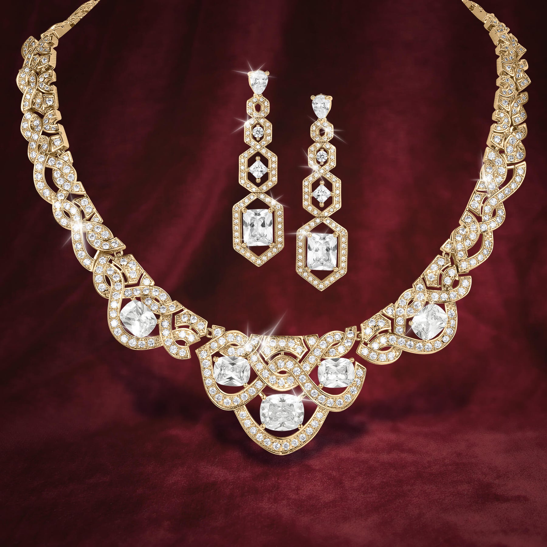 Turn heads and steal the spotlight with this exquisite necklace and earring set, the epitome of luxury and elegance. Finished in lustrous yellow gold, the necklace draws the eye with a dazzling cushion cut Diamondeau®, flawless simulated diamond centerpiece, flanked on either side by two equally brilliant stones, while graceful loops and scrolls intertwine around them in a lace like pattern. Every curve is meticulously paved with brilliant cut gems, creating a collar that shimmers from every angle. Complementing this masterpiece, the coordinating drop earrings feature a striking emerald cut stone, all embraced by the same intricate sparkling design. Finished in rich yellow gold, this ensemble exudes a regal glow, perfect for moments when only sophistication will do.