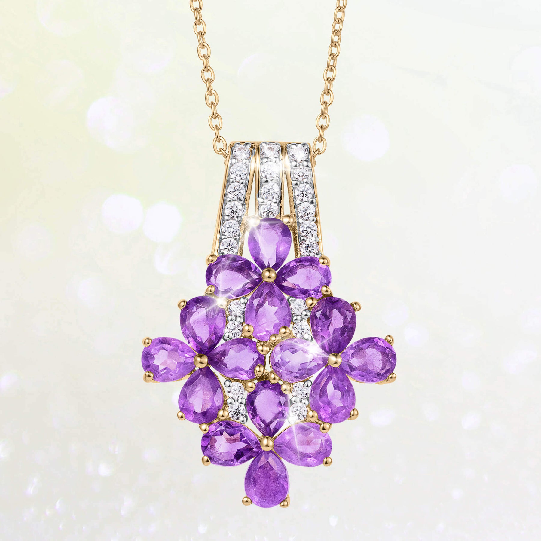Crafted in sterling silver with a warm gold-plated finish, this floral-inspired collection captures the elegance of a garden in full bloom. Each piece showcases a radiant arrangement of pear-cut amethyst stones forming soft, petal-like silhouettes, complemented by brilliant Diamondeau®, flawless simulated diamond accents that add extra sparkle and depth to the design. The vibrant violet hues stand out beautifully against the golden setting, creating a luxurious and feminine glow. This collection offers a graceful harmony of color, texture and light, which is perfect for those who adore jewelry that blossoms with beauty.