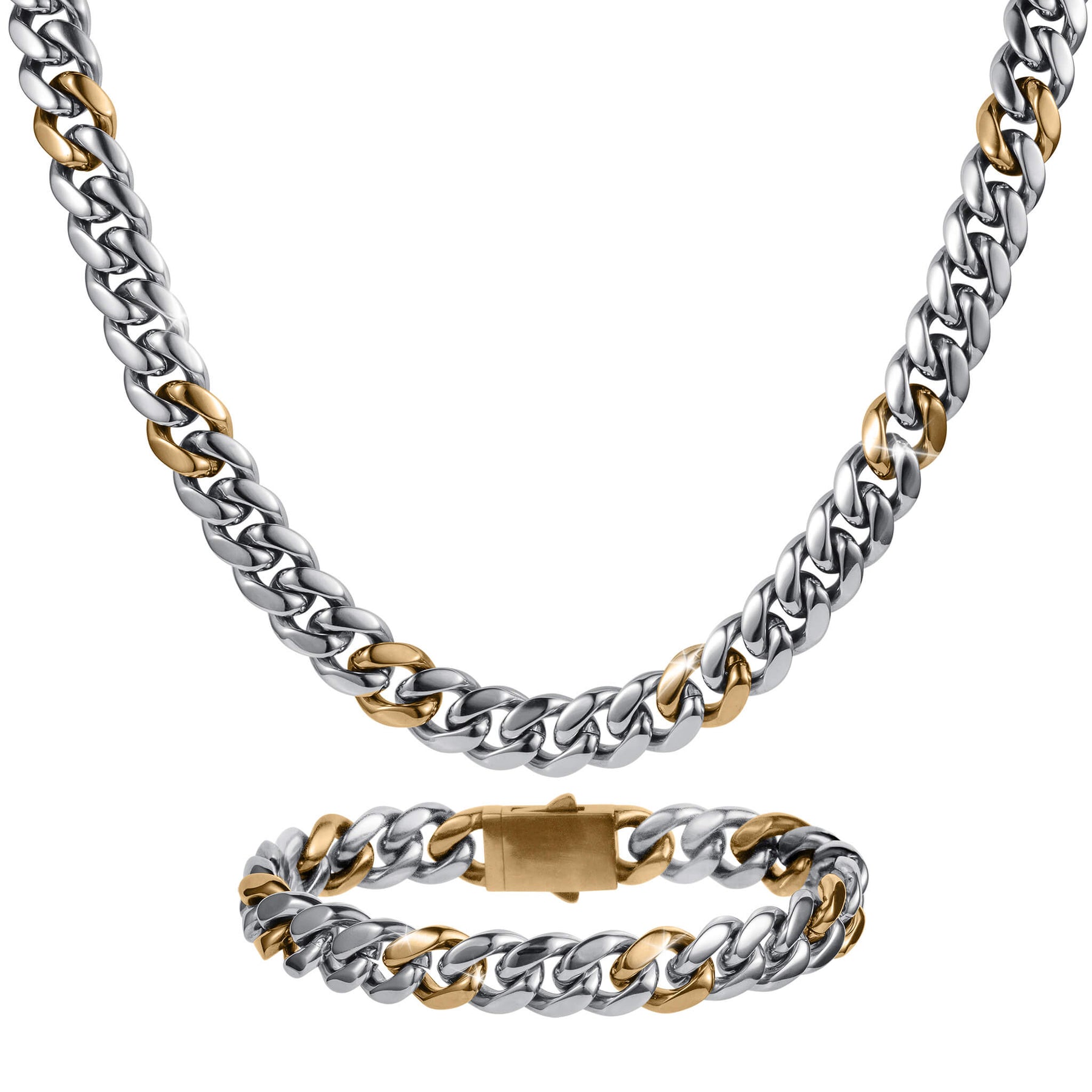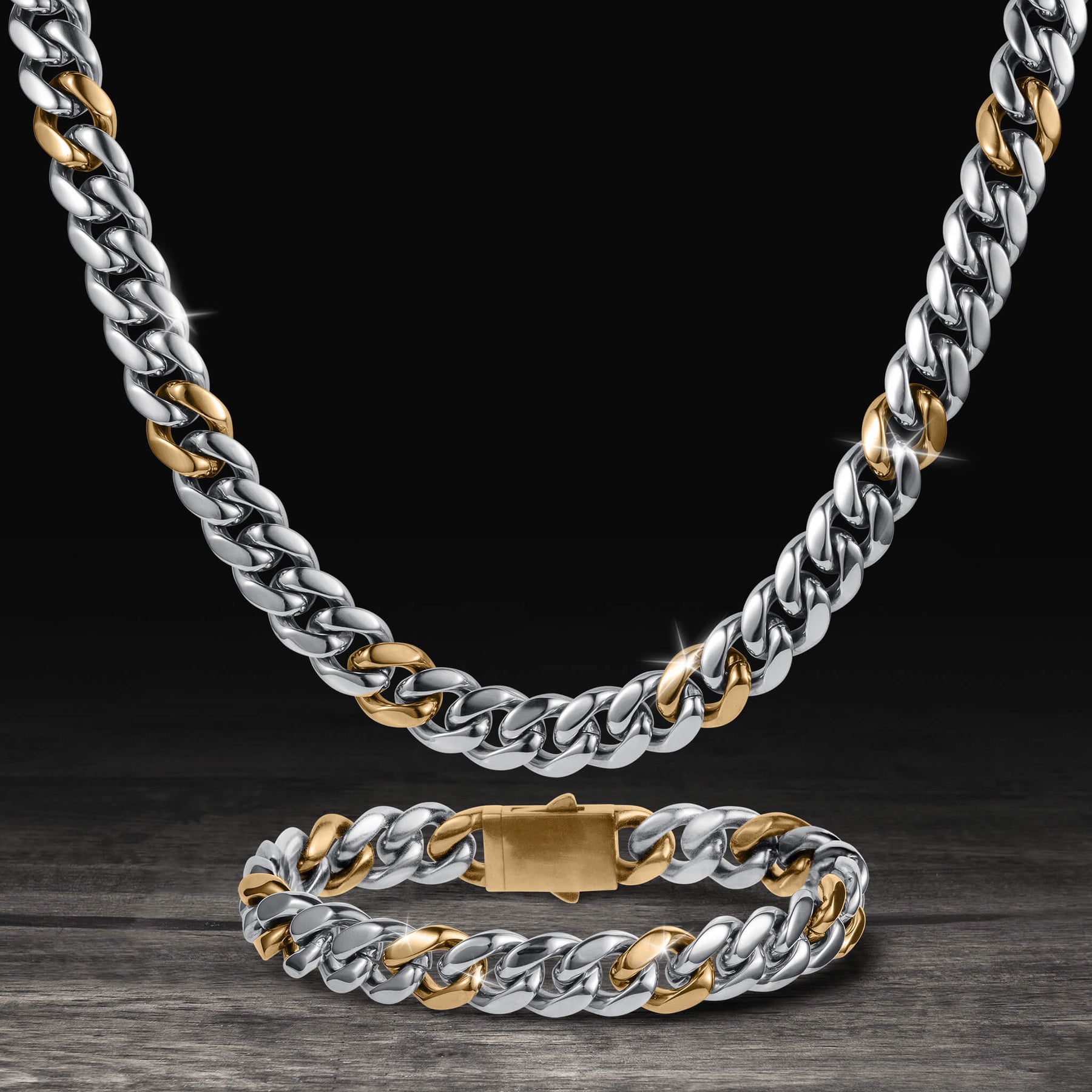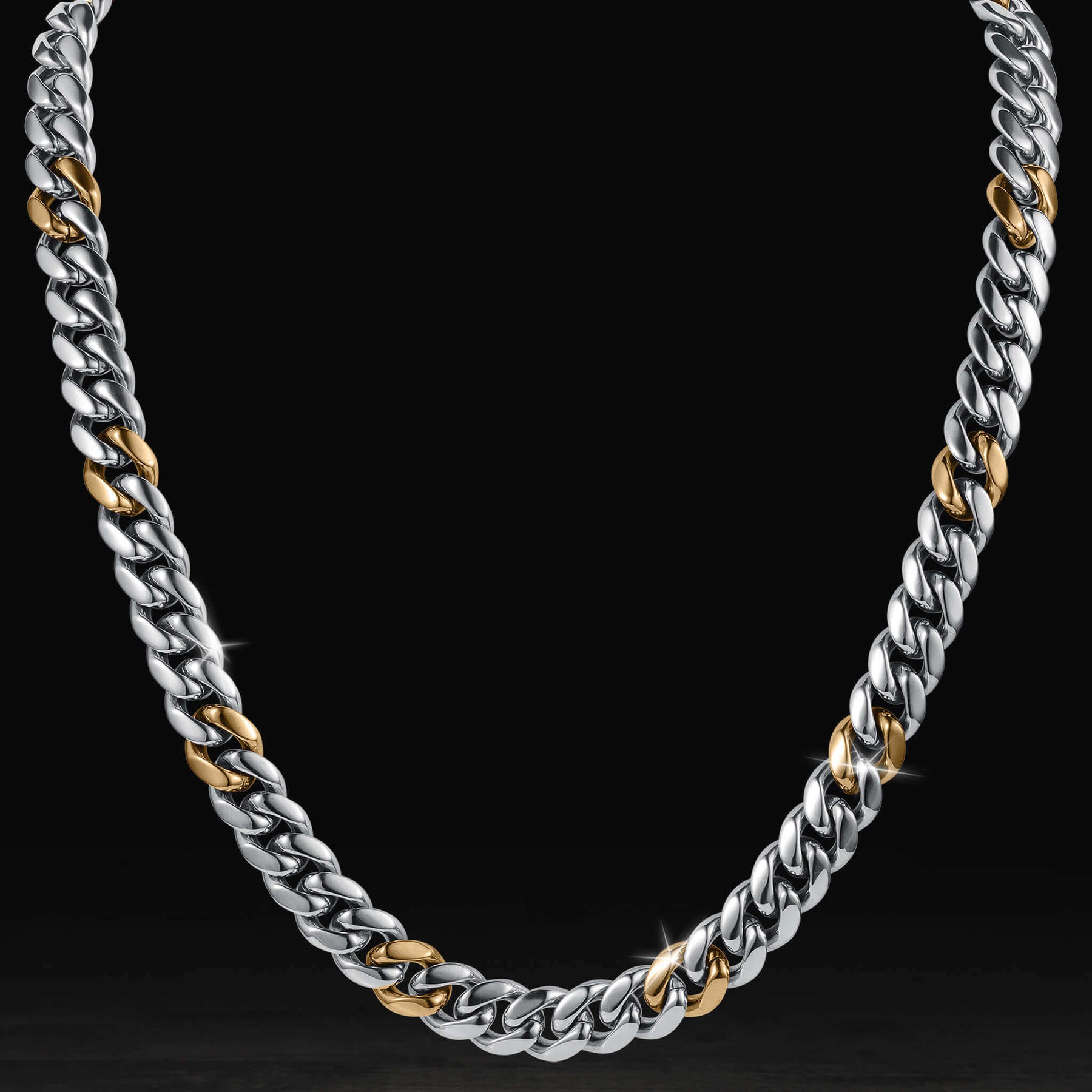 Crafted from premium stainless steel with a bold two-tone finish, this collection is built for those who refuse to conform. The overall look is unapologetically masculine. It is heavy, sleek, and engineered with a confident presence. Each piece features a classic curb chain upgraded with modern edge: thick, high-polish links with intermittent gold accents that catch the light with every move. The clasp is designed as a focal point, set with precision-cut Diamondeau®, flawless simulated diamond that adds a sharp, unexpected flash without compromising strength. Rugged structure meets refined detail, creating a balance of durability, shine, and attitude. This collection is made to stand out. Made to break convention.