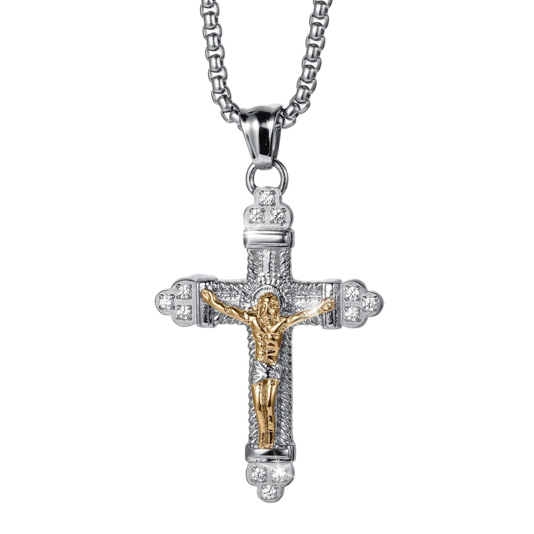 A classic symbol of faith meets modern craftsmanship in this two-tone stainless steel crucifix pendant. Designed with a bold masculine presence, the cross features a polished stainless steel base accented with a contrasting gold-tone figure, creating a striking visual balance. Sparkling Diamondeau®, our exclusive simulated gemstone, stones are carefully set throughout the design, adding brilliance and highlighting the intricate detailing of the crucifix. Meaningful and stylish, this pendant serves as a powerful expression of faith.