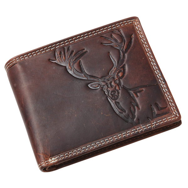 Handcrafted from the finest leather, this wallet offers both standout style and modern practicality. It provides ample space with dedicated compartments for notes and cards, while built-in RFID protection shields your information from unwanted scanning. This rich brown design is embossed with a majestic stag, a symbol of strength and grace. It is finished with bold white contrast stitching, creating a piece that blends craftsmanship with distinctive character. Upgrade your everyday essentials.