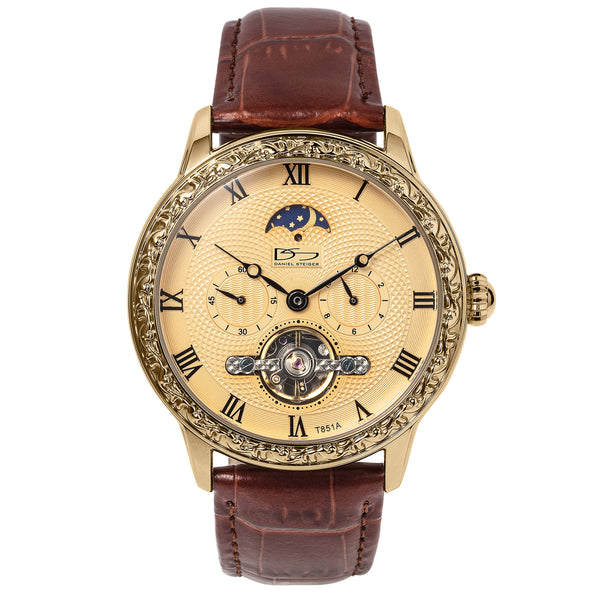 This timepiece brings together the perfect blend of classic style and modern functionality. The golden bezel is decorated with an intricate scroll detailing, giving it a distinct and sophisticated appearance. A moon phase and tourbillion inspired feature on the dial provide both aesthetic appeal and practical functionality. An automatic movement provides you with timekeeping that requires no battery changes, keeping you on schedule and on time. All finished with a comfortable croc effect brown leather strap. This is the ultimate timepiece boasting a unique combination of luxurious design and innovative features