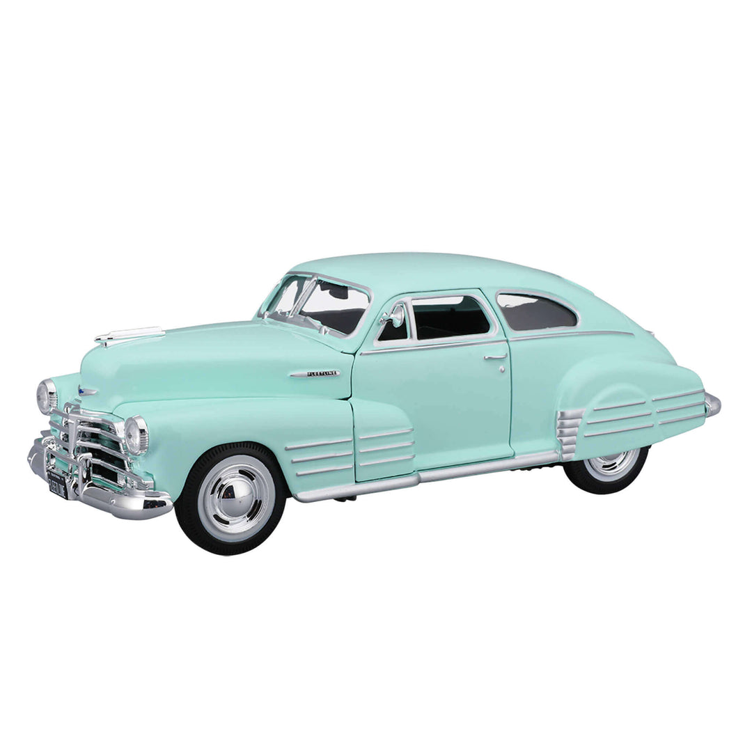A stunning tribute to the iconic design of the post-war era. This 1:24 scale model in green features a detailed stovebolt straight-six engine, gleaming chrome grille and bumpers. A fully detailed interior brings the era to life. The Aero fastback design with skirted rear wheel wells and smooth-rolling rubber tires with steering wheel controlled front wheels make it perfect for your collection.