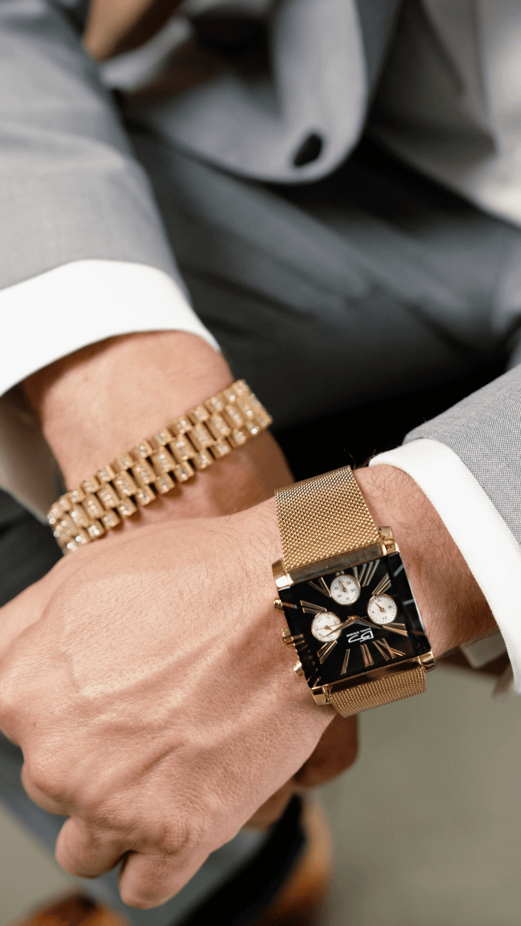 The epitome of sophistication and elegance, the Baron watch embodies luxury craftsmanship and bold styling. This timepiece has a sleek, square black dial and features a precision quartz movement, the ultimate in functionality. A comfort fit Milanese mesh gold plated band will add refinement to any gentleman’s wrist.