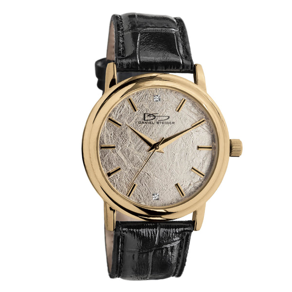 Classic styles never go out of fashion. You’ll fall in love with this watch the moment you see it. It’s the perfect must-have accessory for every gentleman. This classic timepiece includes a gold finished case with an elegant white gold foil dial; placed at 6 and 12 o’clock positions are crystals. A black croc grain leather strap completes the look.